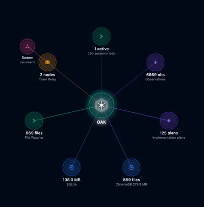 That’s it! OAK is now running. The dashboard is your primary interface — use it to configure settings, explore agent activity, search code, and manage project memory. The CLI is only needed for setup and maintenance tasks.